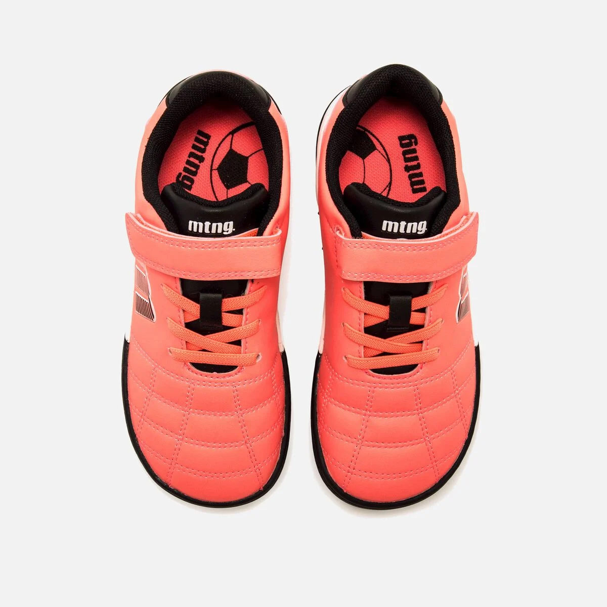 Las botas de fútbol barefoot con multitacos de Mustang Free en coral flúor están diseñadas y desarrolladas en colaboración con el Dr. Juanjo López, traumatólogo deportivo e infantil, respeta el desarrollo natural del pie sin renunciar a la resistencia necesaria en el juego.