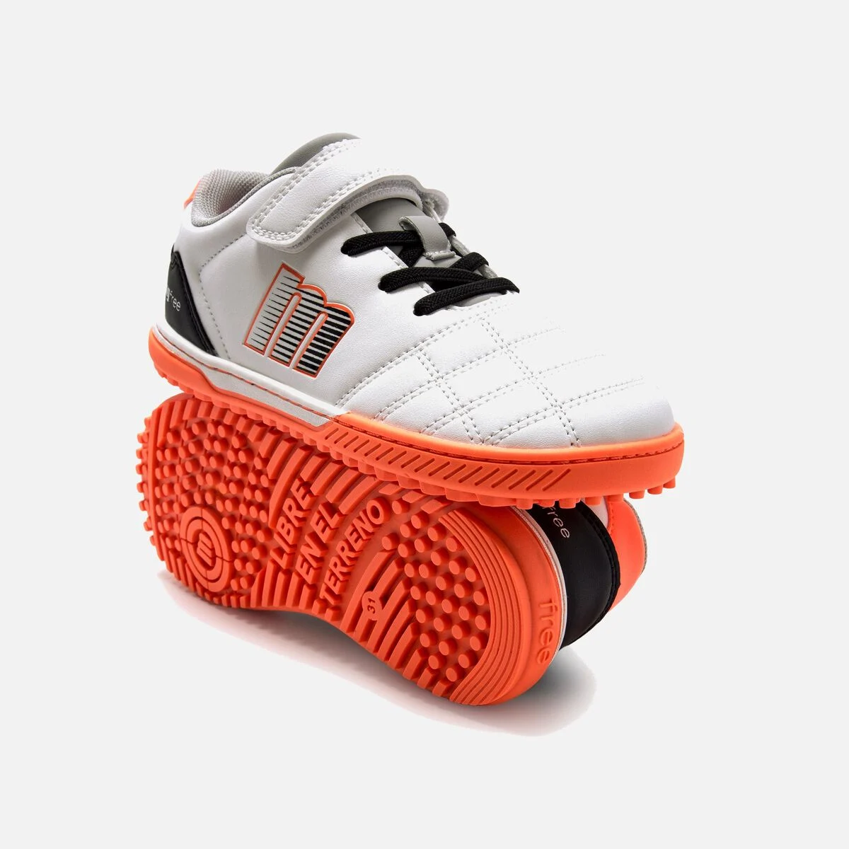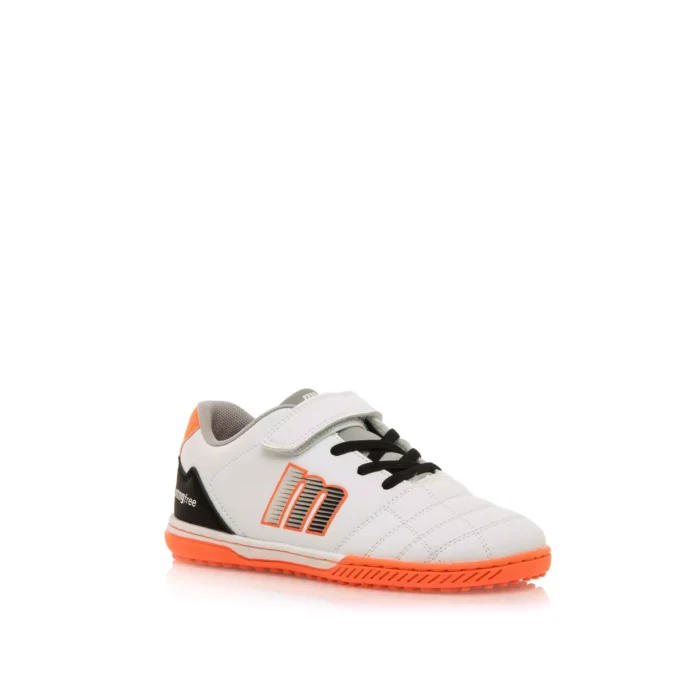 Las botas de fútbol barefoot con multitacos de Mustang Free en color blanco combinado con naranja están diseñadas y desarrolladas en colaboración con el Dr. Juanjo López, traumatólogo deportivo e infantil, respeta el desarrollo natural del pie sin renunciar a la resistencia necesaria en el juego.