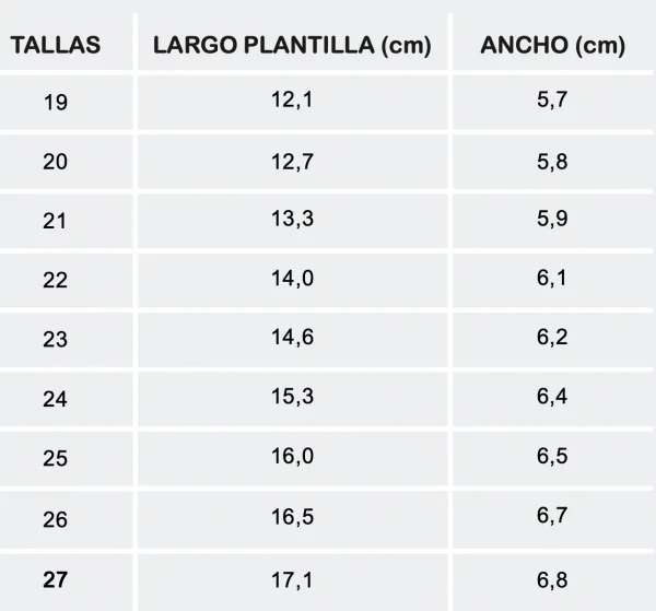 - Plantilla lisa sin formativos ni ningún otro elemento. También se puede sacar, es decir, es extraíble. De esta manera, podremos revisar si el zapato le queda bien o cuando se le va quedando pequeño.